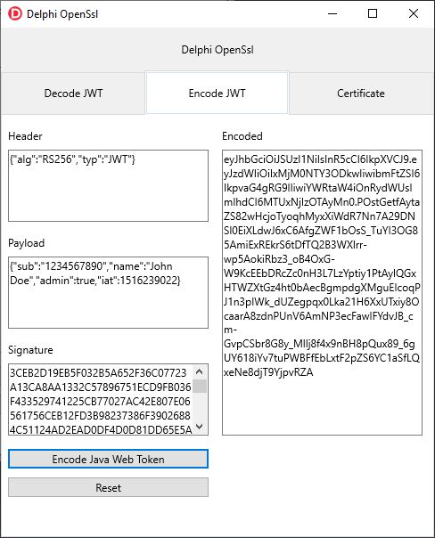 Note: This is not meant as an exhaustive look at JWTs. We are only demonstrating one algorithm. There are other nice libraries for handling JWTs in Delphi. Our intent is to show how OpenSsl can do this in a simple, straightforward and cross-platform way.