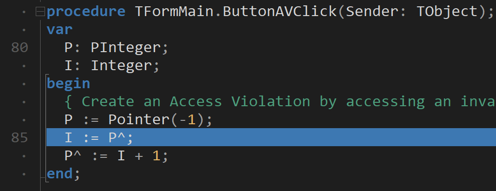 Because we used the Line Number Generator tool, you can see that the exception originates at line 85 in the FMain unit, in the TFormMain.ButtonAVClick method. And sure enough, that is where the culprit is: