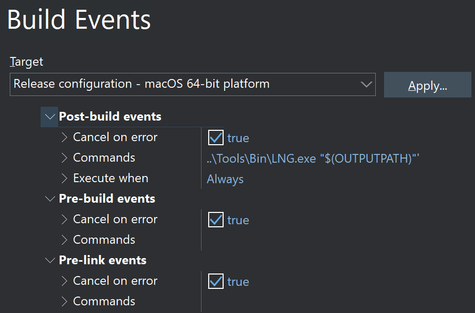 The “Cancel on error” setting should be left to True so compilation will fail if the tool fails or cannot be found. The “Commands” setting should be set to the name of the tool, passing the name of the generated executable as the parameter (you should use the "$(OUTPUTPATH)" variable for this, including the double quotes). If you put the LNG.exe tool somewhere in your path, then you don’t need to specify a directory for the command. Otherwise, you need to provide an absolute or relative directory.