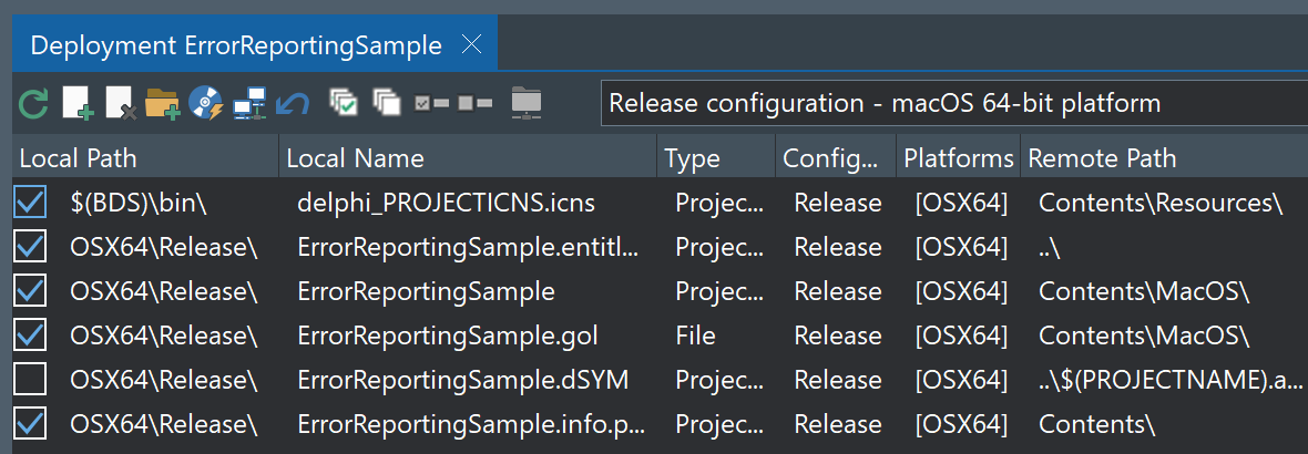 Open the Deployment manager (Project | Deployment) and add the just generated .gol file (found in the “OSX64\<Config>\” directory). Set the remote path to “Contents\MacOS\”: